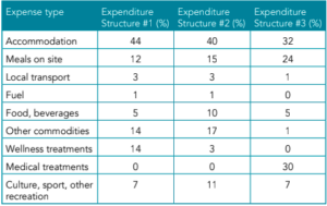 The key research input for modeling the impact of tourism, and health tourism in particular, at the destination level is how / where money is spent. In the table at right, case #1 suggests relatively high spending on wellness services, case #2 shows a destination with minimal guest spending on wellness interests, and case #3 describes high expenditures in medical tourism.