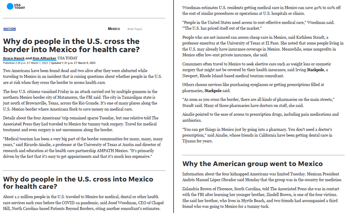 Thank you to Grace Hauck and Ken Alltucker for interviewing me for the USAToday article “Why do people in the U.S. cross the border into Mexico for health care?” Consumers should ask clinics or doctors how often they have done particular procedures and ask to speak with patients who have used the clinic before.